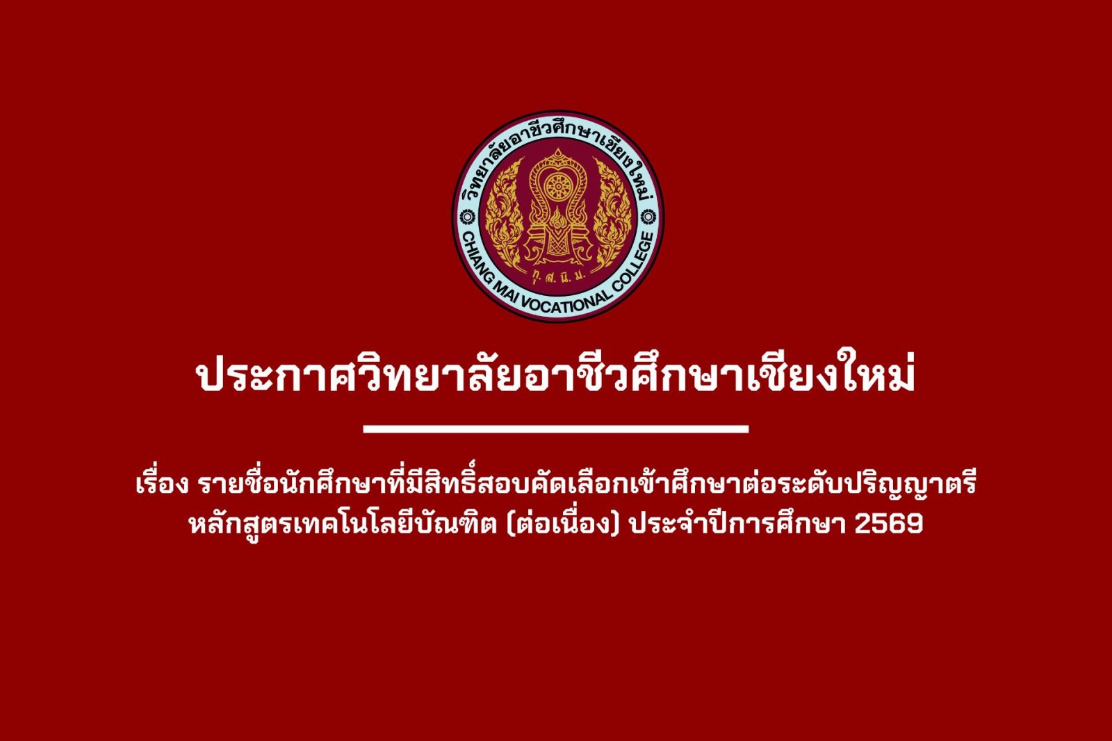 ประกาศรายชื่อนักศึกษาที่มีสิทธิ์สอบคัดเลือกเข้าศึกษาต่อระดับปริญญาตรี หลักสูตรเทคโนโลยีบัณฑิต (ต่อเนื่อง) ประจำปีการศึกษา 2569 25 มีนาคม 202625 มีนาคม 2026ภัสราภรณ์ สุขอัมพรข่าวสารสำหรับนักเรียน นักศึกษา ประกาศรายชื่อนักศึกษาที่มีสิทธิ์สอบคัดเลือกเข้าศึกษาต่อระดับปริญญาตรี หลักสูตรเทคโนโลยีบัณฑิต (ต่อเนื่อง) ประจำปีการศึกษา 2569 1 file(s) 385.37 KB Download Post Views: 165 Facebook iconFacebookTwitter iconTwitterLINE iconLine
