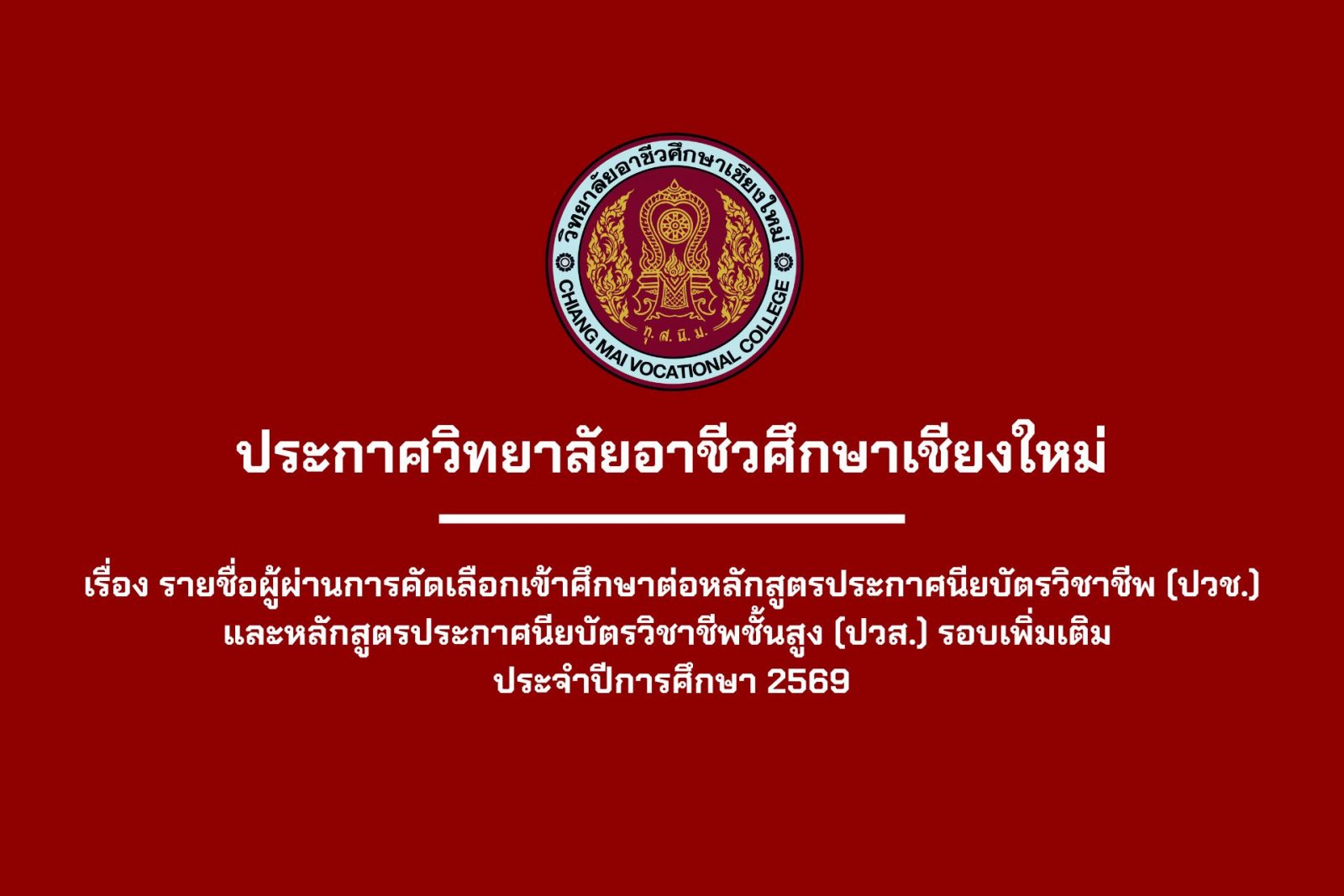ประกาศรายชื่อผู้ผ่านการคัดเลือกเข้าศึกษาต่อหลักสูตรประกาศนียบัตรวิชาชีพ (ปวช.) และหลักสูตรประกาศนียบัตรวิชาชีพชั้นสูง (ปวส.) รอบเพิ่มเติม ประจำปีการศึกษา 2569